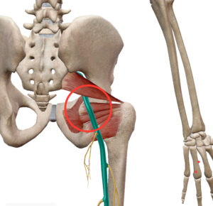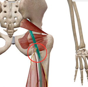 しかし実際には、坐骨神経やその枝分かれした神経は体の深い部分を通っており、さまざまなポイントで滑走不全や圧迫が起こります。例えば以下の部位です。