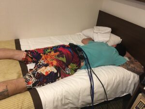 ↑選手の施術をしていた時の様子。当院の医療機器を持って行って現地のホテルで施術していました。写真には写っていませんが、体がでかいので足がベッドからはみ出てます。