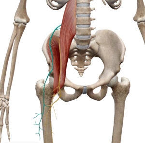 これらの神経は腰から股関節の前を通って太ももへと伸びており、途中で筋肉に締め付けられたり、癒着したりすることで痛みやしびれを引き起こします。