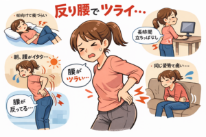 反り腰は、単に姿勢が悪いだけではなく、骨盤の傾きや筋肉バランスの崩れ、日常生活のクセによって起こります。特にデスクワーク、立ち仕事、育児、運動不足、片足重心などが続くと、腰が反りやすい状態になり、腰の緊張や痛みにつながります。